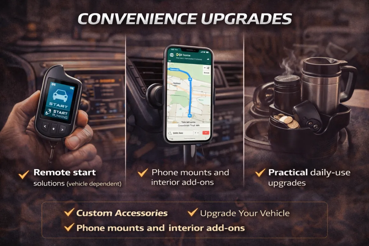 We install a range of vehicle-dependent accessories like convenience upgrades, interior/exterior add-ons, lighting upgrades, and tech accessories.