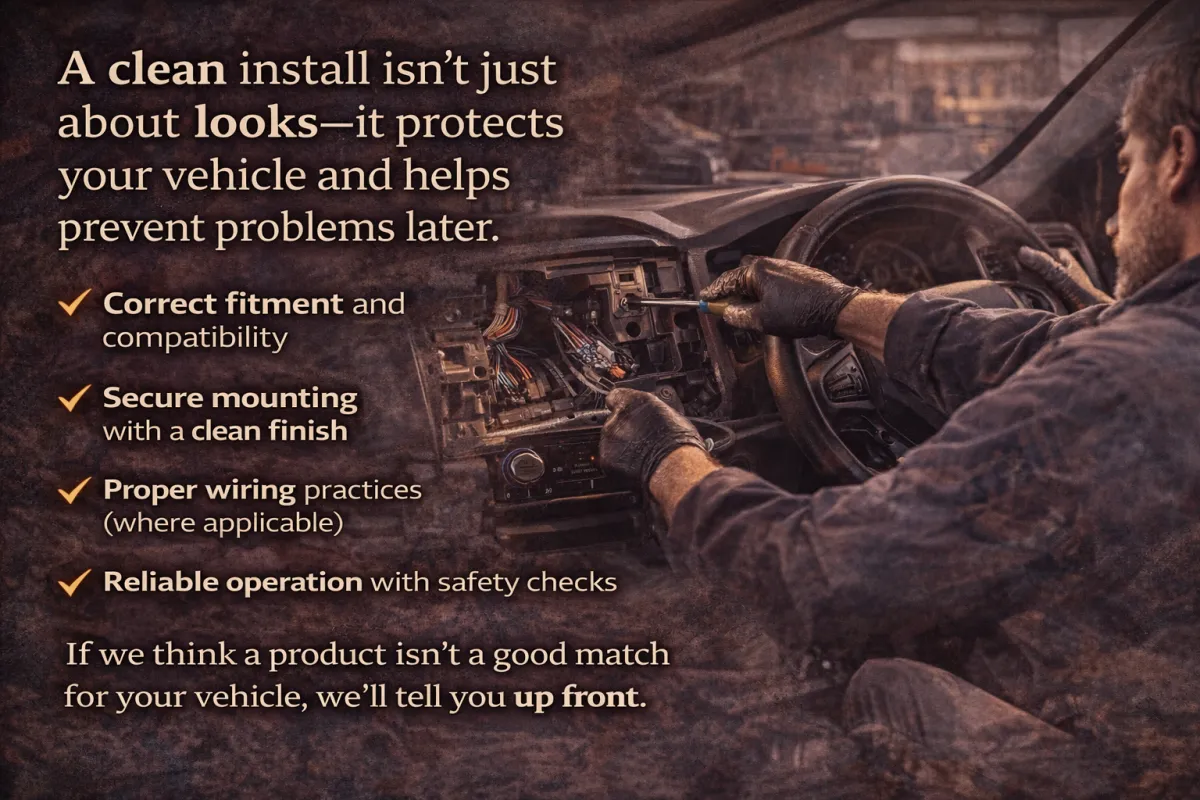 A clean install isn’t just about looks—it protects your vehicle and helps prevent problems later. We focus on correct fitment and compatibility, secure mounting with a clean finish, proper wiring practices where applicable, and reliable operation with safety checks. If we think a product isn’t a good match for your vehicle, we’ll tell you up front.