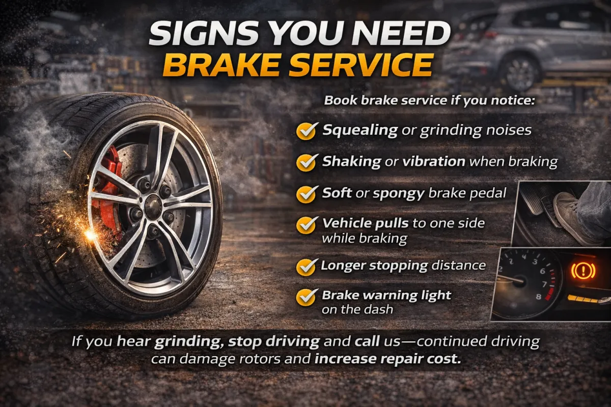 If you hear grinding, stop driving and call us—continued driving can damage rotors and increase repair cost.
