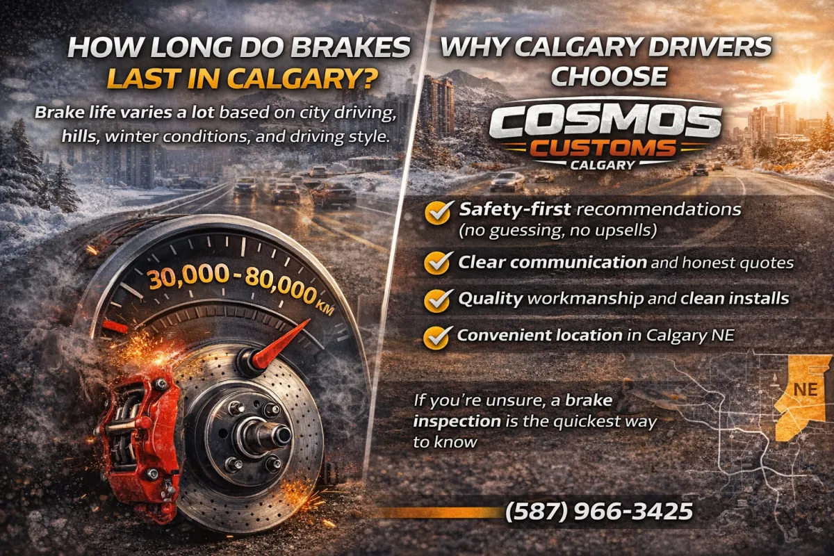 Brake life varies a lot based on city driving, hills, winter conditions, and driving style. Many pads last 30,000–80,000 km, but your vehicle may be different. If you’re unsure, a brake inspection is the quickest way to know.