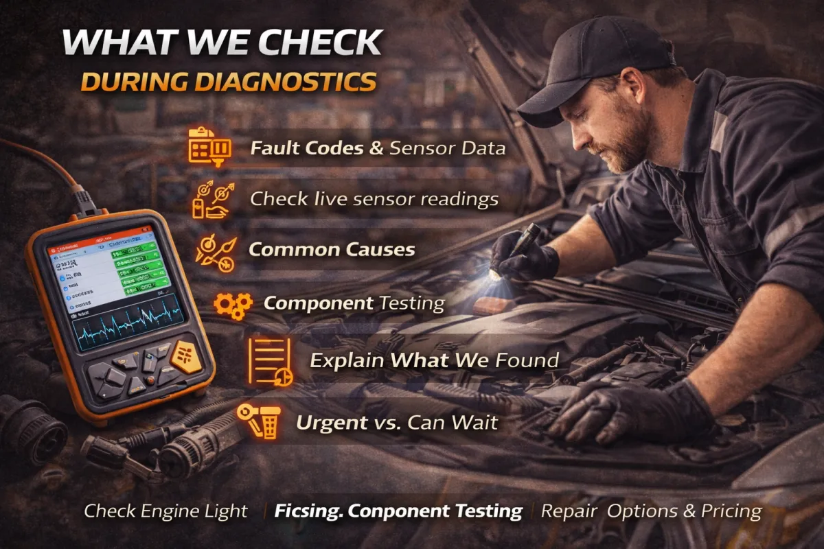 It usually includes a scan for fault codes, reviewing live sensor data, confirming symptoms, and basic checks to narrow down the cause.