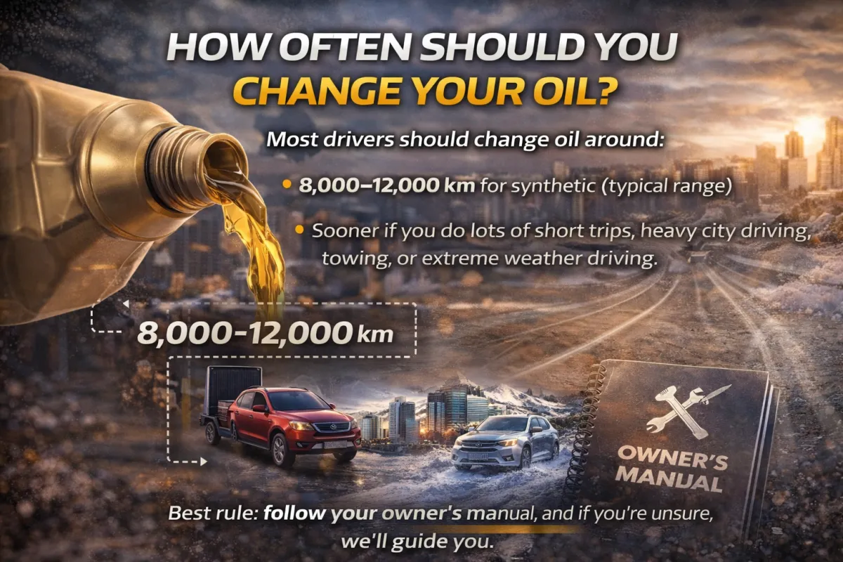 Most drivers are around 8,000–12,000 km for synthetic, but your owner’s manual is the best guide. Short trips and heavy driving may need sooner.